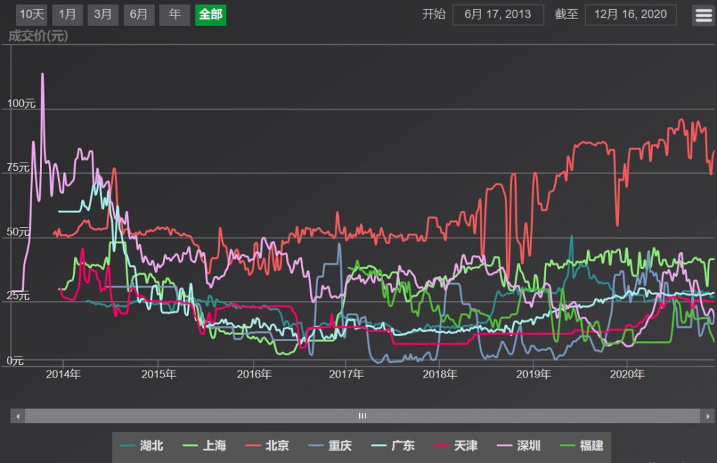 國內試點市場配額交易價格(數據來源:中國碳排放交易網)