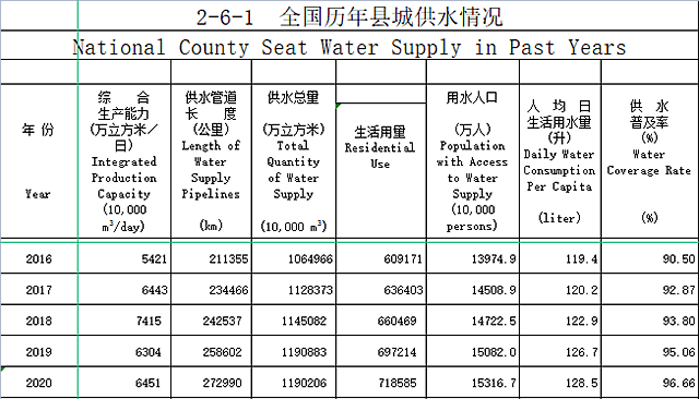 縣城供水,截止2020年,綜合生產(chǎn)能力達(dá)6451萬立方米/日,2018年,供水綜合生產(chǎn)能力提升至7415萬立方米/日,2019年、2020年出現(xiàn)回落。供水管網(wǎng)長度達(dá)27.3萬公里,較“十二五”新增21.3%。供水總量達(dá)119億立方米,增長約11.3%。