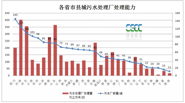 四川、山東、安徽等省市鄉(xiāng)鎮(zhèn)污水處理廠數(shù)量排名靠前,其中四川省最多,達(dá)2211個(gè),處理能力為219萬立方米/日,鄉(xiāng)鎮(zhèn)污水處理裝置處理能力為276萬立方米/日。從污水廠處理能力來看,排行靠前的是廣東、江蘇、山東等地,分別為623萬立方米/日、476萬立方米/日、370萬立方米/日等。
