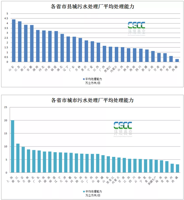 上一篇中提到的城市污水廠平均污水處理能力來看,除開上海的平均污水處理能力達(dá)20萬噸/日外,浙江省城市污水廠平均處理能力達(dá)11萬噸/日,吉林、湖北、廣東、河南、湖南等省市城市污水廠平均處理能力排在靠前的位置,大約在8萬噸/日。可以看到,浙江省在城市和縣城的污水廠平均處理能力都排在前列,可見污水廠單體規(guī)模相對較大。山東、江蘇、安徽縣城污水處理廠平均處理能力較大,而城市污水處理廠則處在全國的中等水平。