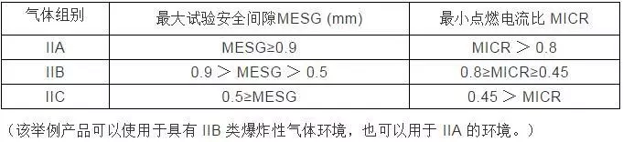 ii類隔爆型電氣設備或本質安全型電氣設備,按其適用于爆炸性氣體混合物的最大試驗安全間隙或最小點燃電流比,進一步分為iia、iib和iic類。如下表所示。