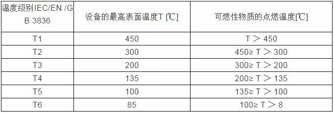 這是與氣體點燃溫度有關的電氣設備(假定環境溫度為40℃時)的最高表面溫度,點燃能量與點燃溫度無關。