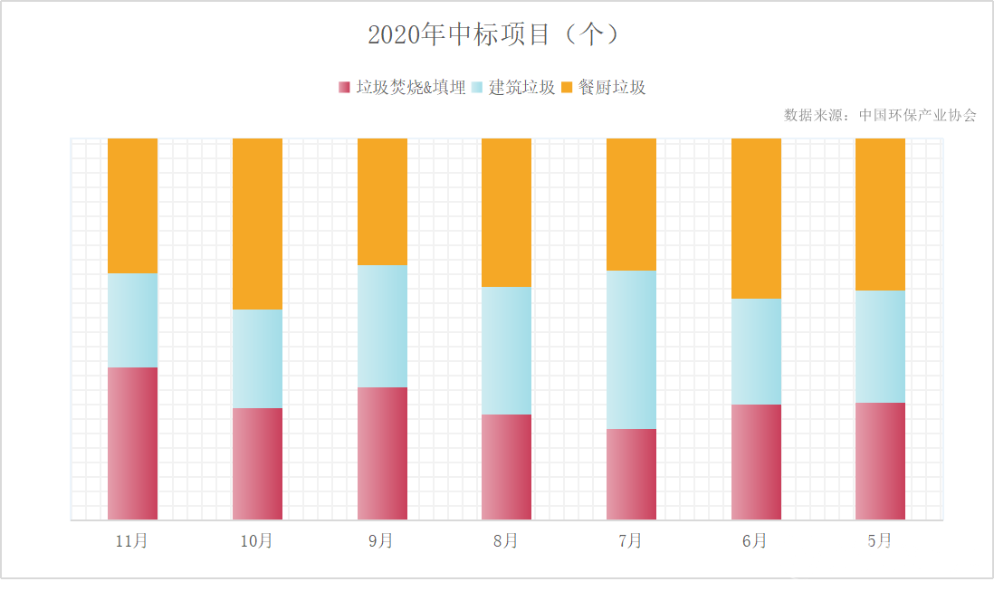 2020年前11個月,全國垃圾焚燒中標項目共計311項,總投資金額共計655.15億元;餐廚垃圾處理處置中標項目共計361項,總投資金額194.6億元;2020年5月到11月,全國建筑垃圾處理處置中標項目共計213項,總投資金額61.85億元。